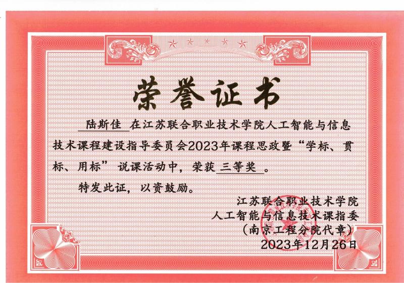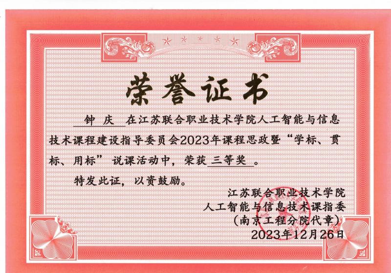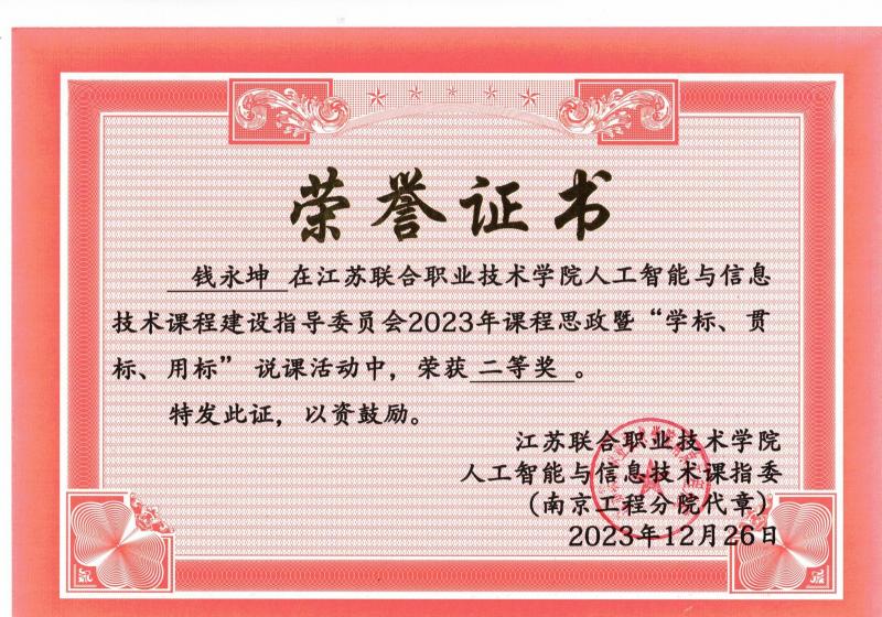 12月26日,在盐城生物工程分院举办的江苏联合职业技术学院人工智能与信息技术课程指导委员会第二次课程思政集体备课暨学标、贯标、用标活动中,我校教师表现出色,罗曦曦老师荣获一等奖,钱永坤、苑宇坤老师荣获二等奖,钟庆、陆斯佳老师荣获三等奖。