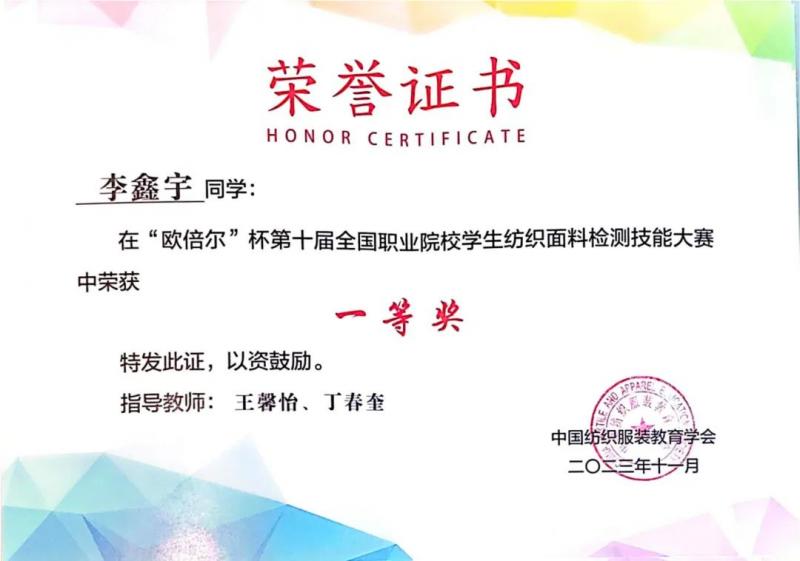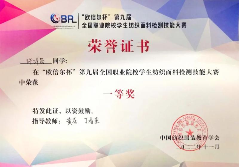 许泽昌,2023届现代纺织技术专业毕业生,在校期间获“2022全国纺织面料检测大赛一等奖”“2020全国纺织面料检测大赛三等奖”。毕业后就职于吴江福华织造有限公司,致力为地区纺织经济的发展做贡献。