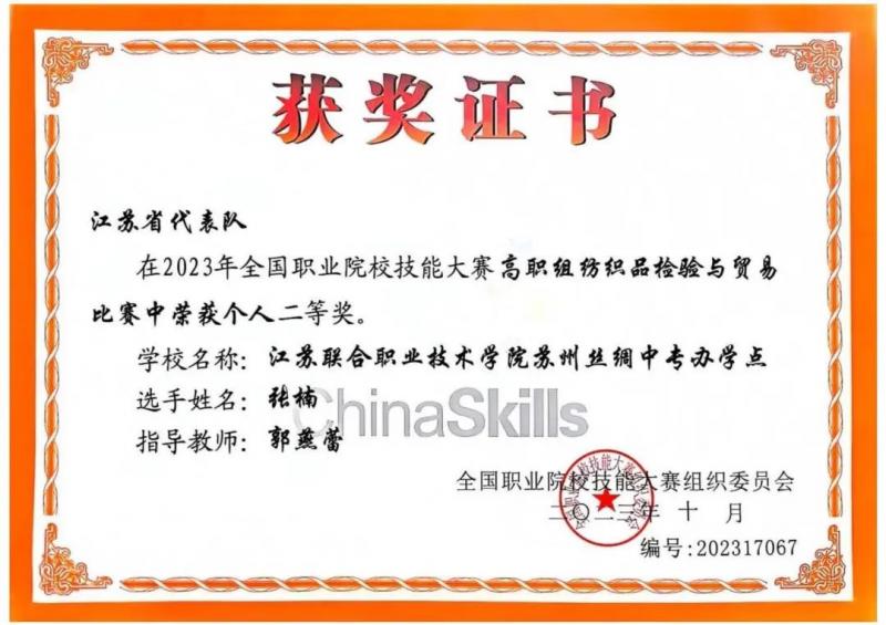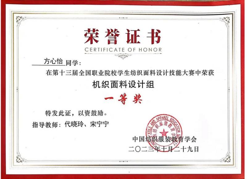 毕逸清,2021届现代纺织技术专业毕业生。在校期间获校级、区级“三好学生”以及国家励志奖学金,参加全国纺织服装类职业院校面料设计大赛二等奖。目前就职于浙江台华新材料股份有限公司,已成长为一名优秀的分析报价员。