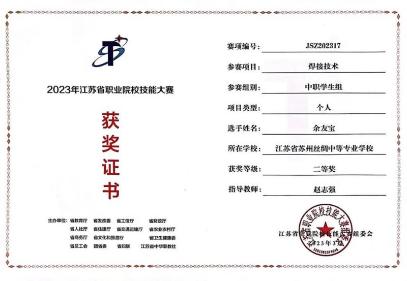 曹福润,2018届机械制造技术专业毕业生。在校期间曾获“优秀学生干部”“优秀共青团干部”“优秀志愿者”“苏州市职业院校技能标兵”“吴江区最优小工匠”等荣誉称号,获江苏省职业院校技能大赛一等奖,被保送本科院校——江苏理工学院。进入大学后,先后获得一带一路暨金砖国家技能发展与技术创新大赛之“嘉科杯”国际焊接大赛”一等奖、全国大学生焊接创新大赛三等奖。