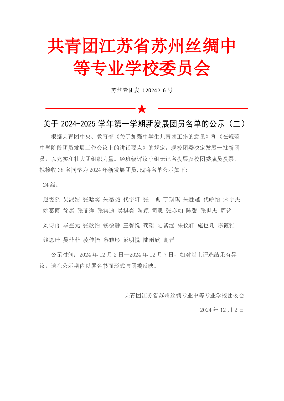 关于2024-2025学年第一学期入团积极分子名单公示(二)