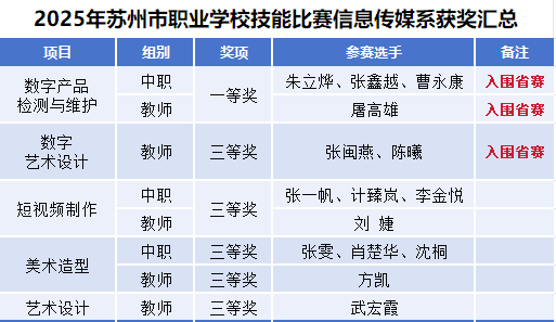 近日,2025年苏州市职业学校技能比赛圆满落幕。我系选派优秀学子参加了《短视频》、《美术造型》、《艺术设计》、《数字产品检测与维护》、《数字艺术设计》和《网络建设与运维》等项目的角逐,与来自全市各职业院校的选手同台竞技。经过激烈比拼,我系学子凭借扎实的专业技能、过硬的心理素质和出色的临场发挥,有两个项目更是成功突围,强势晋级省赛,为学校赢得了荣誉!