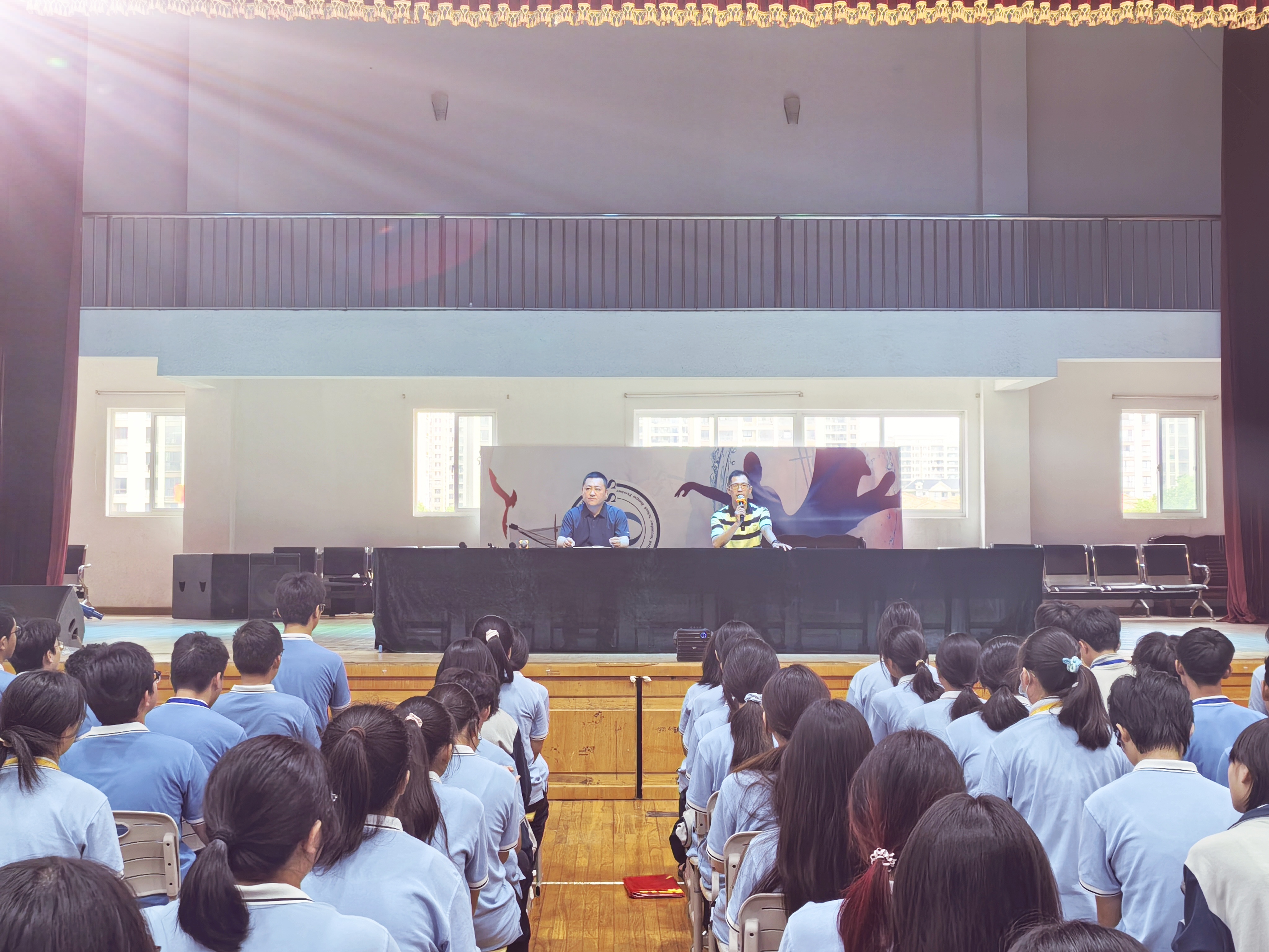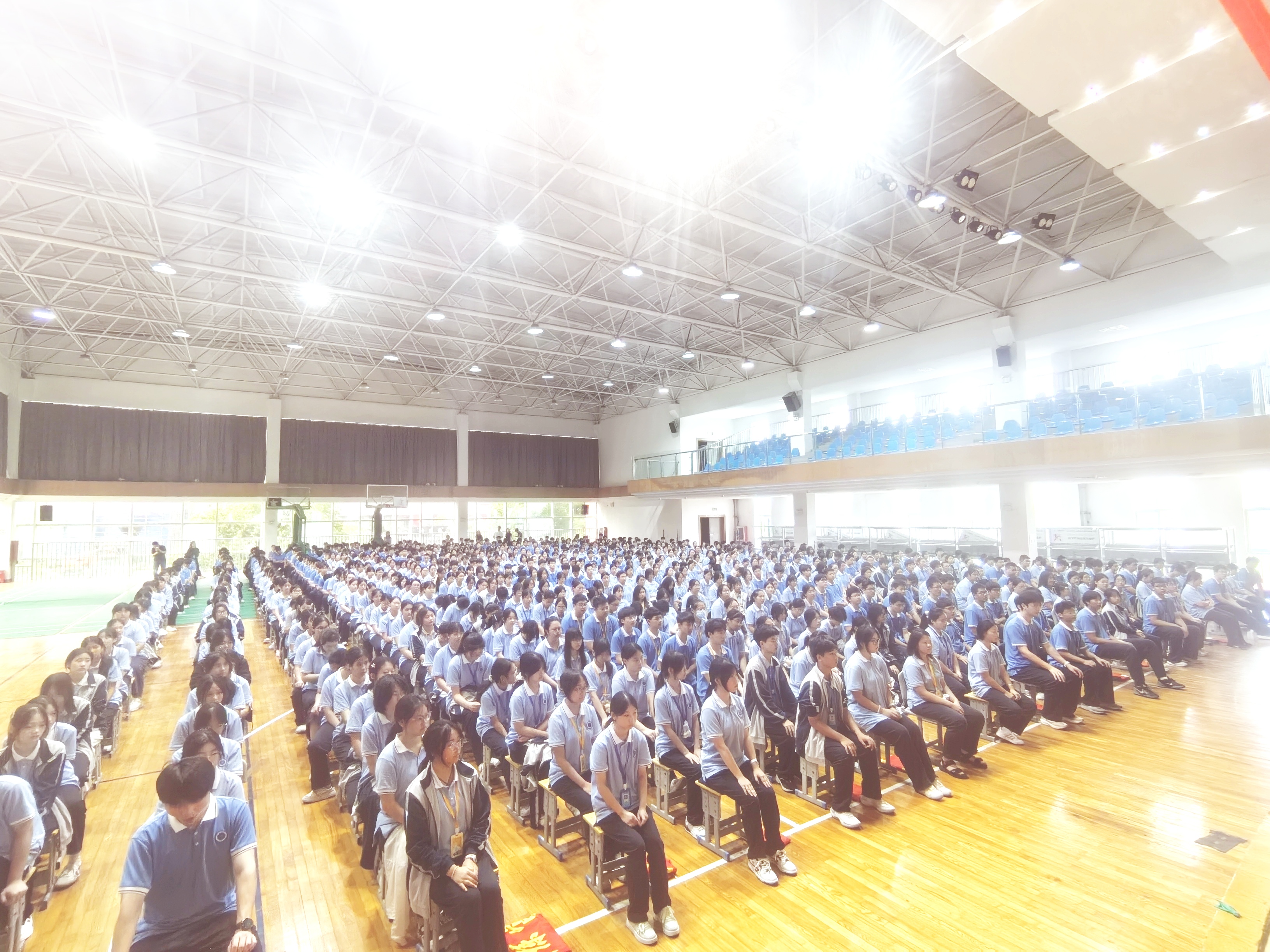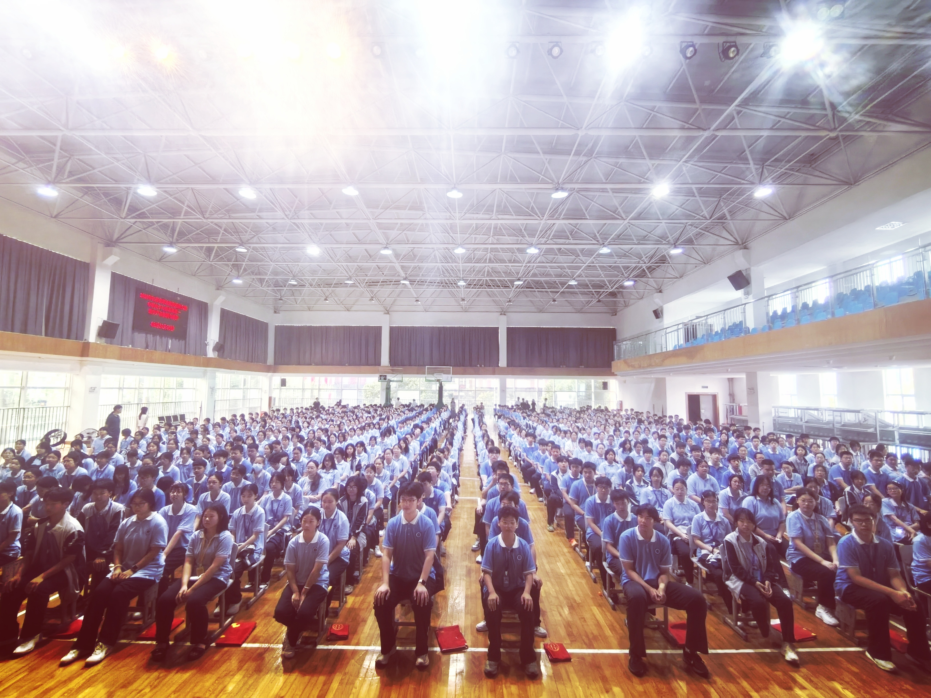 会场上,全体新生身穿蓝色校服,坐姿挺拔、整齐划一,眼神中闪烁着期待与坚毅。