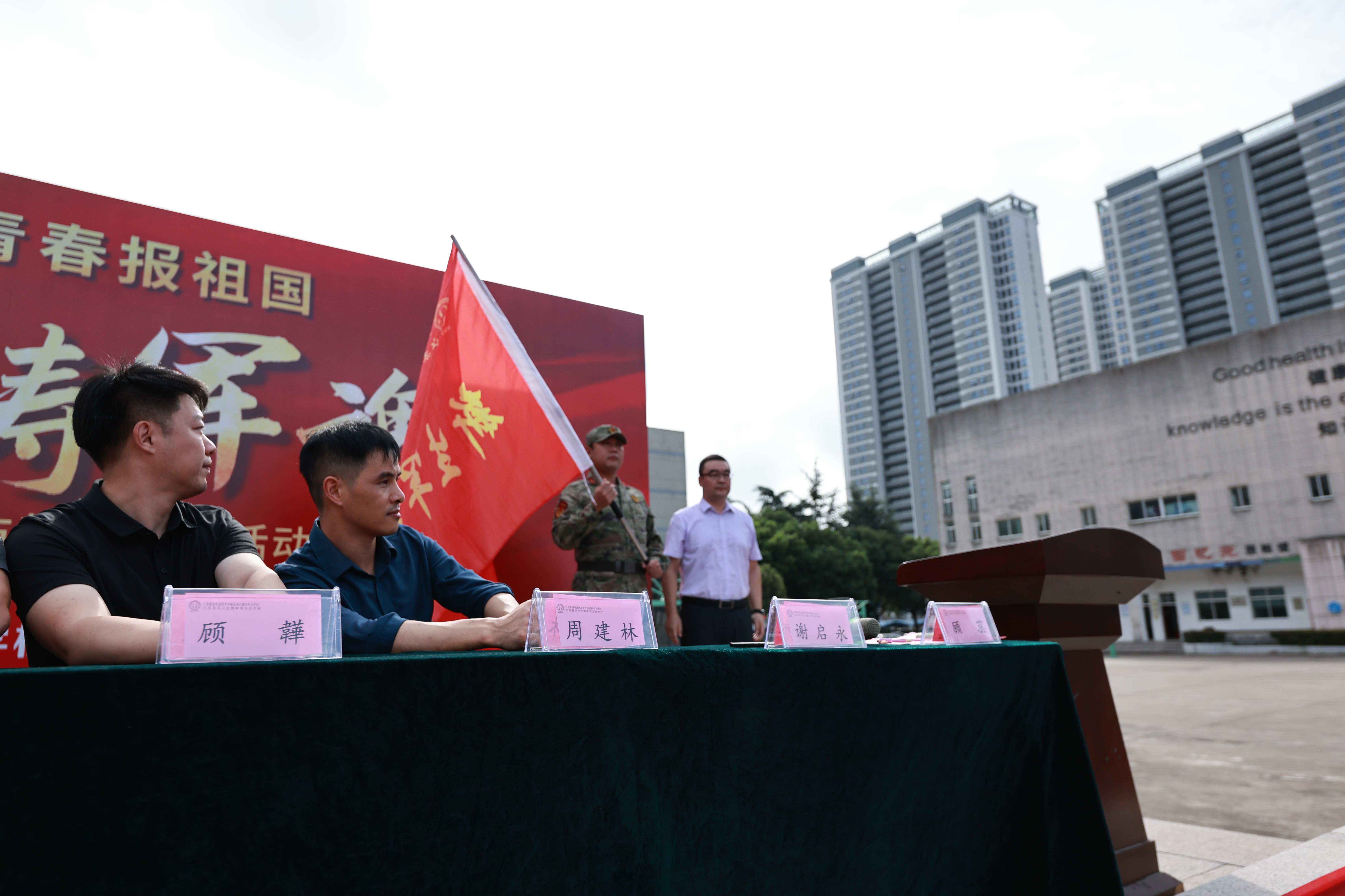 在雄壮的进行曲中,王宾副校长为军训团授旗,鲜艳的团旗在训练场上飘扬,张志凯副书记宣布“开营”,标志着2025级新生军训工作正式启动。