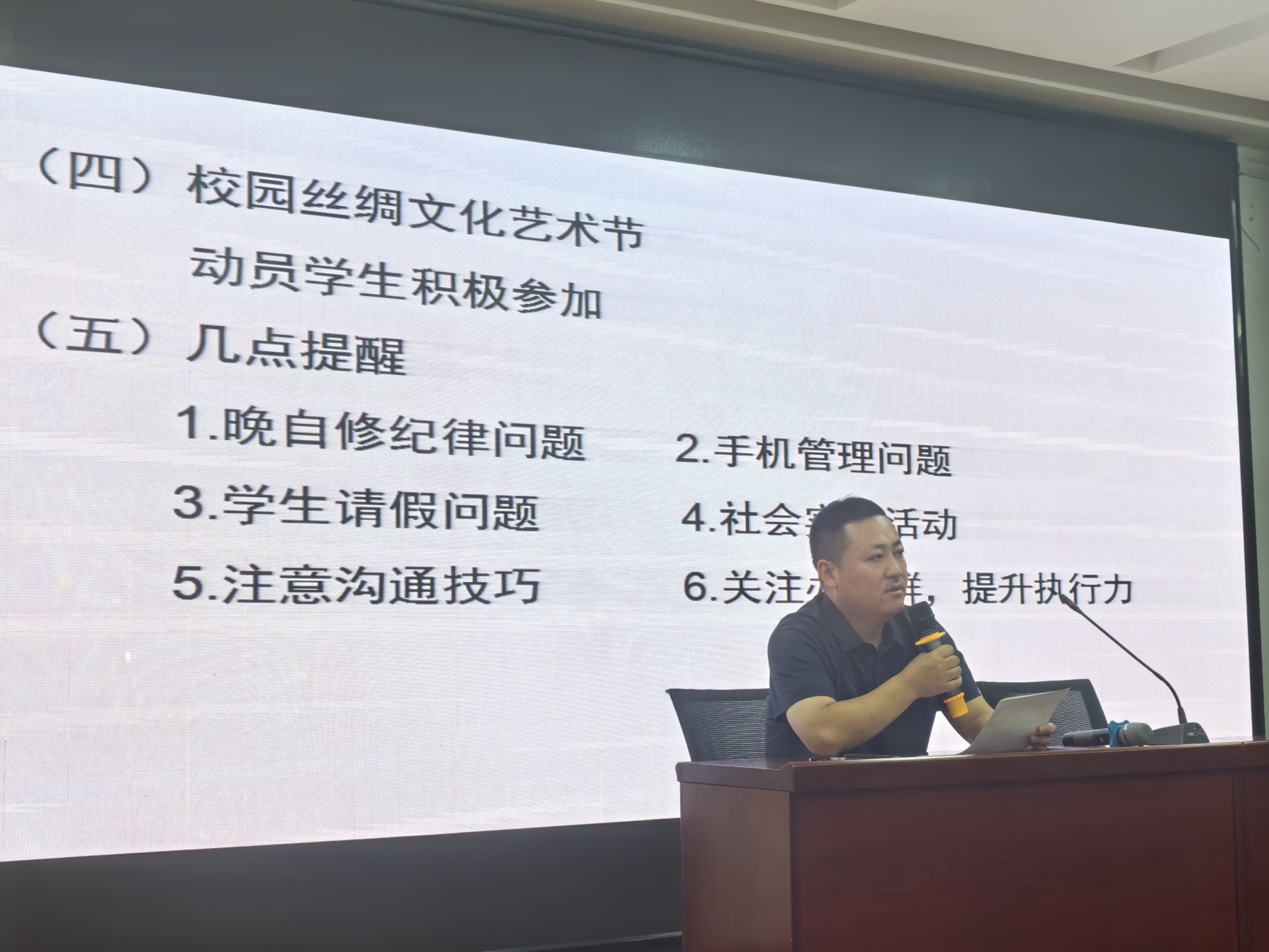 此外,谢主任还动员班主任鼓励学生积极参加校园丝绸文化艺术节,丰富学生校园生活。针对晚自修纪律、手机管理、学生请假等日常管理问题,谢主任也一一作出提醒,还强调班主任要注意沟通技巧,关注细节,提升工作执行力。