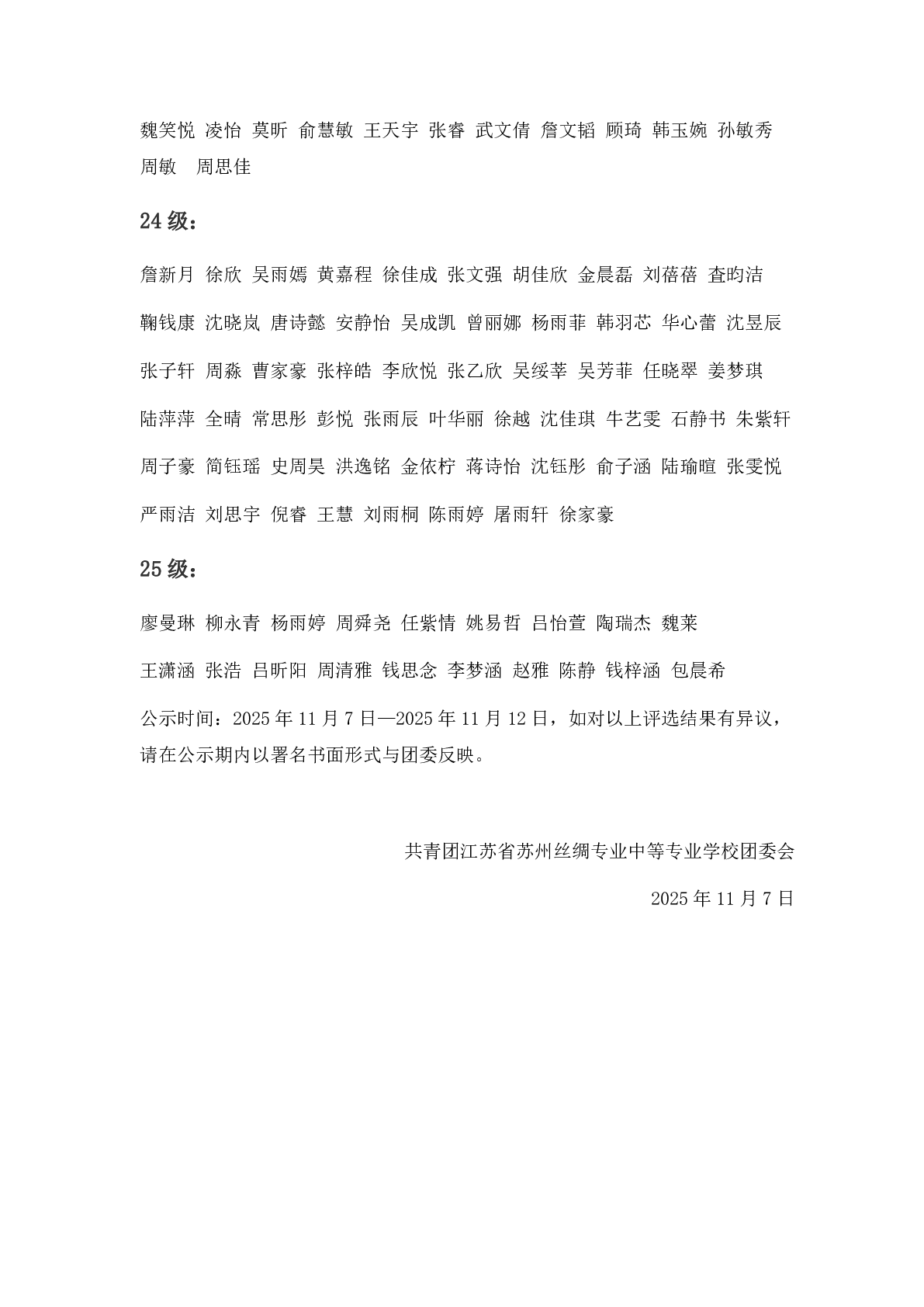 关于2024-2025学年第二学期新发展团员名单的公示