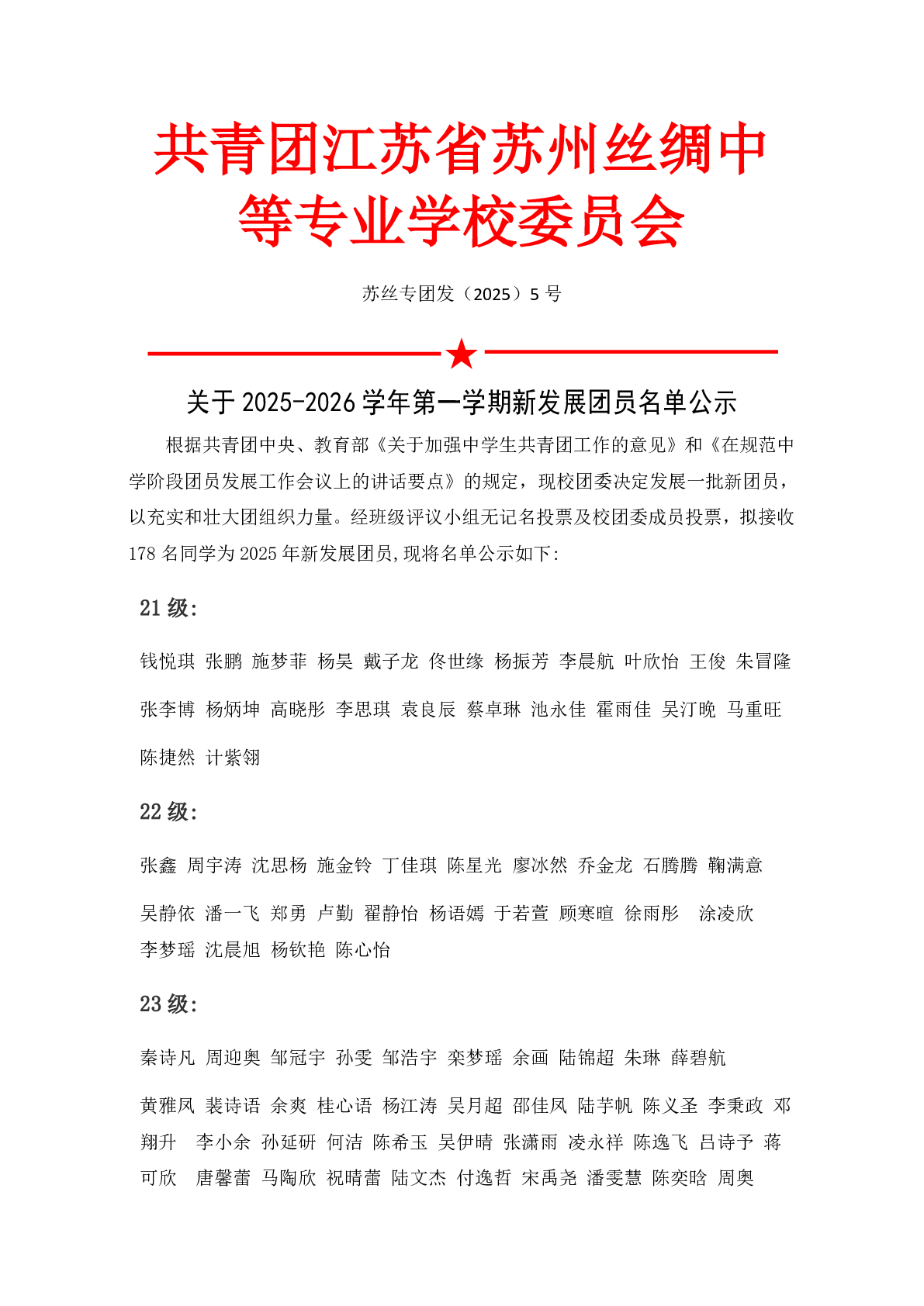 关于2025-2026学年第一学期新发展团员名单公示