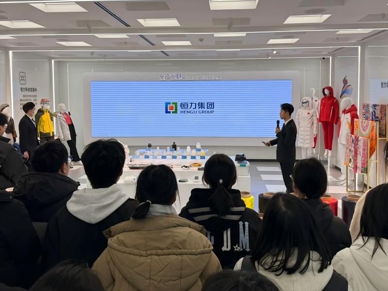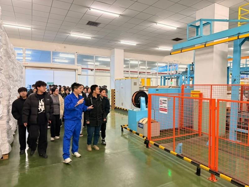第二站——江苏恒力化纤股份有限公司。作为行业龙头企业,恒力化纤整洁规范的生产环境、先进的自动化生产线让同学们印象深刻。企业人力资源部负责人通过现场讲解,详细介绍了企业的发展历程、核心产品、岗位设置等学生关心的问题,并表示非常欢迎学校毕业生前来实习,企业会为实习生配备专属导师,提供系统化培训,助力学生快速成长。