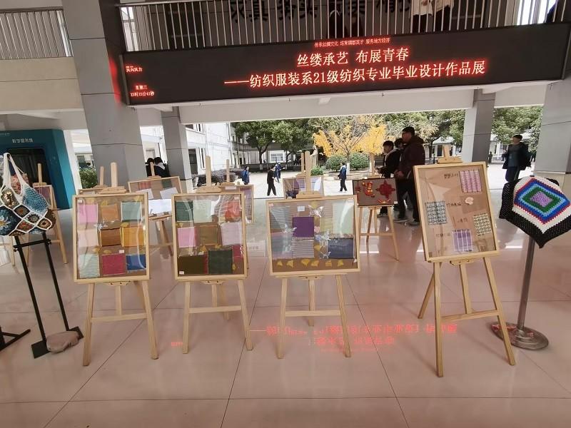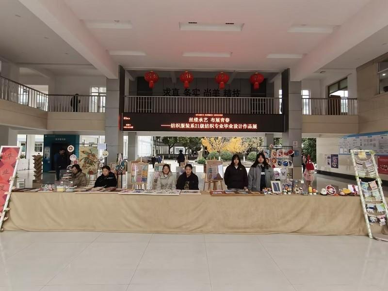 12 月 10 日至 11 日,我校纺织服装系 21 级纺织专业毕业设计成果展在行政楼大厅顺利举办。本次展览既是对学子们专业学习成果的集中检阅,也是传统纺织技艺与现代设计思维深度融合的一次生动实践,为校园增添了浓郁的专业实践与文化创新氛围。