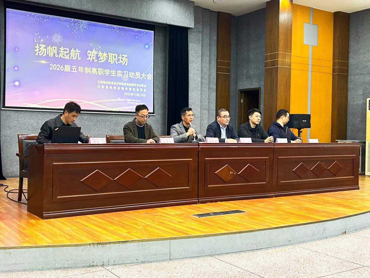 为扎实推进学生实习就业工作,引导学生以积极心态和充分准备迎接职场挑战,12月10日下午,我校在行政楼二楼多功能报告厅隆重召开2026届学生实习动员大会。大会由学生发展指导中心主任周建林主持,党总支副书记、副校长(主持工作)王宾、陆兴宏副校长、各系部负责人、毕业班班主任及全体2026届高职毕业生共同参会。