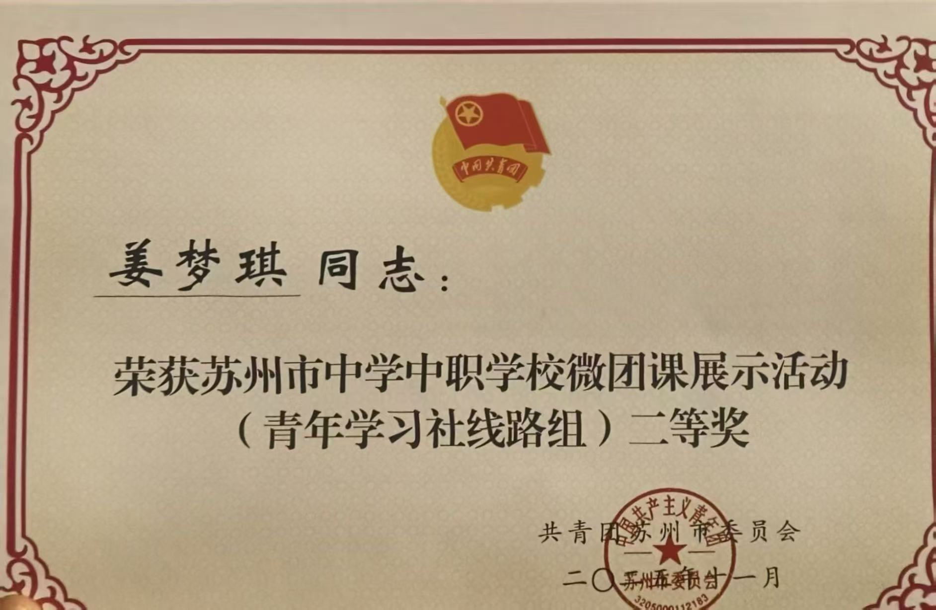 近日,由共青团苏州市委员会主办的2025年苏州市中学中职学校微团课展示活动圆满落幕。我校师生积极参与、精心备赛,在激烈的市级角逐中脱颖而出,教师组顾蕊老师、学生组姜梦琪同学均荣获二等奖,展现了我校共青团工作和思想政治教育的扎实成效与师生良好的精神风貌。
