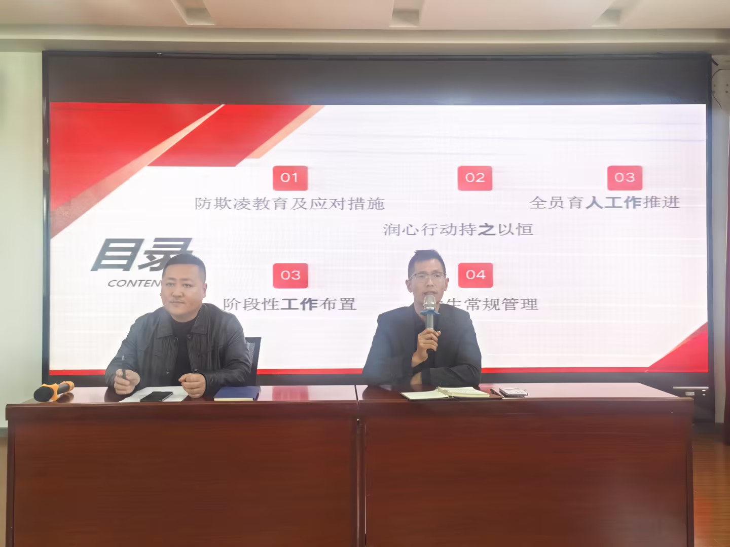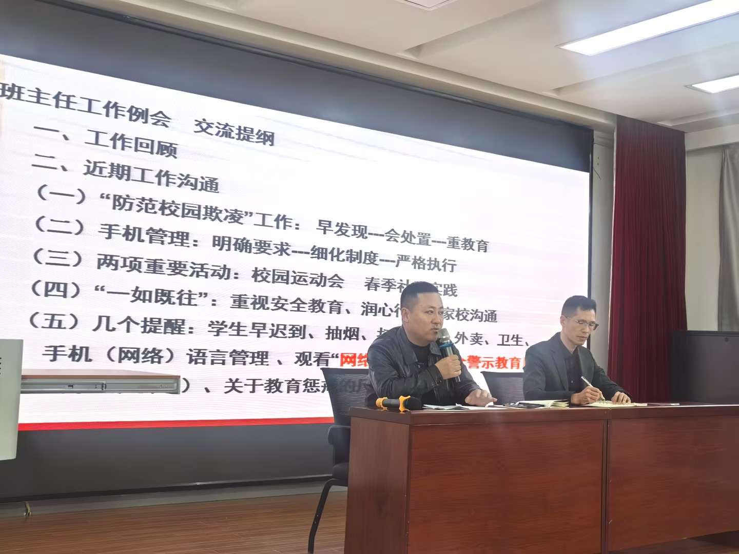 随后,谢启永主任对4月份德育重点工作进行详细布置,围绕五大核心任务提出明确要求。一是深化校园防欺凌教育,明确防欺凌工作具体应对措施,常态化开展防欺凌宣传,引导学生树立文明相处理念,杜绝校园欺凌行为发生;二是持续推进学生润心行动,强调润心工作的长期性和实效性,要求班主任积极开展家访工作,密切关注学生身心健康,联动校心理咨询室开展心理疏导,用爱心和耐心守护学生成长;三是细化学生常规管理,针对学生仪容仪表、迟到请假、校园卫生等常规工作,要求班主任从严要求、持之以恒,引导学生养成良好的行为习惯;四是强化校园违纪教育,预防学生打架斗殴等伤害事件,对违纪行为严肃处理、正向引导,营造纪律严明的校园氛围;五是筑牢学生安全防线,常态化开展个人安全、法治安全、消防安全等宣传教育,通过主题班会、案例讲解等形式,增强学生安全防范意识和自我保护能力。